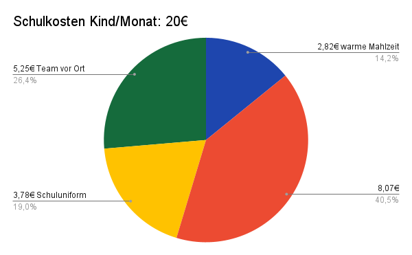 Abzüglich der Herstellungskosten des Posters, der Steuern, der Fixkosten und der Rücklagen bleiben rund 20€ aus dem Erlös für Schulbildung. Das bedeutet, dass wir mit einem Poster A2 im Rahmen einen Monat Schule finanzieren können. Unser Ziel ist es mehr für Schulbildung pro verkauften A2 Poster im Rahmen zu finanzieren, aber dafür müssen unsere Verkaufszahlen wachsen.