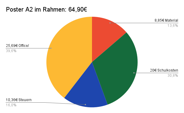 Unser Ziel ist es, die Arbeit von AME zu 100% aus dem Verkauf der Artworks finanzieren zu können. Die Verteilung der Ausgaben können wir am besten mit der Kostenstruktur unserer Produkte veranschaulichen, hier am Beispiel des Posters A2 im Rahmen.