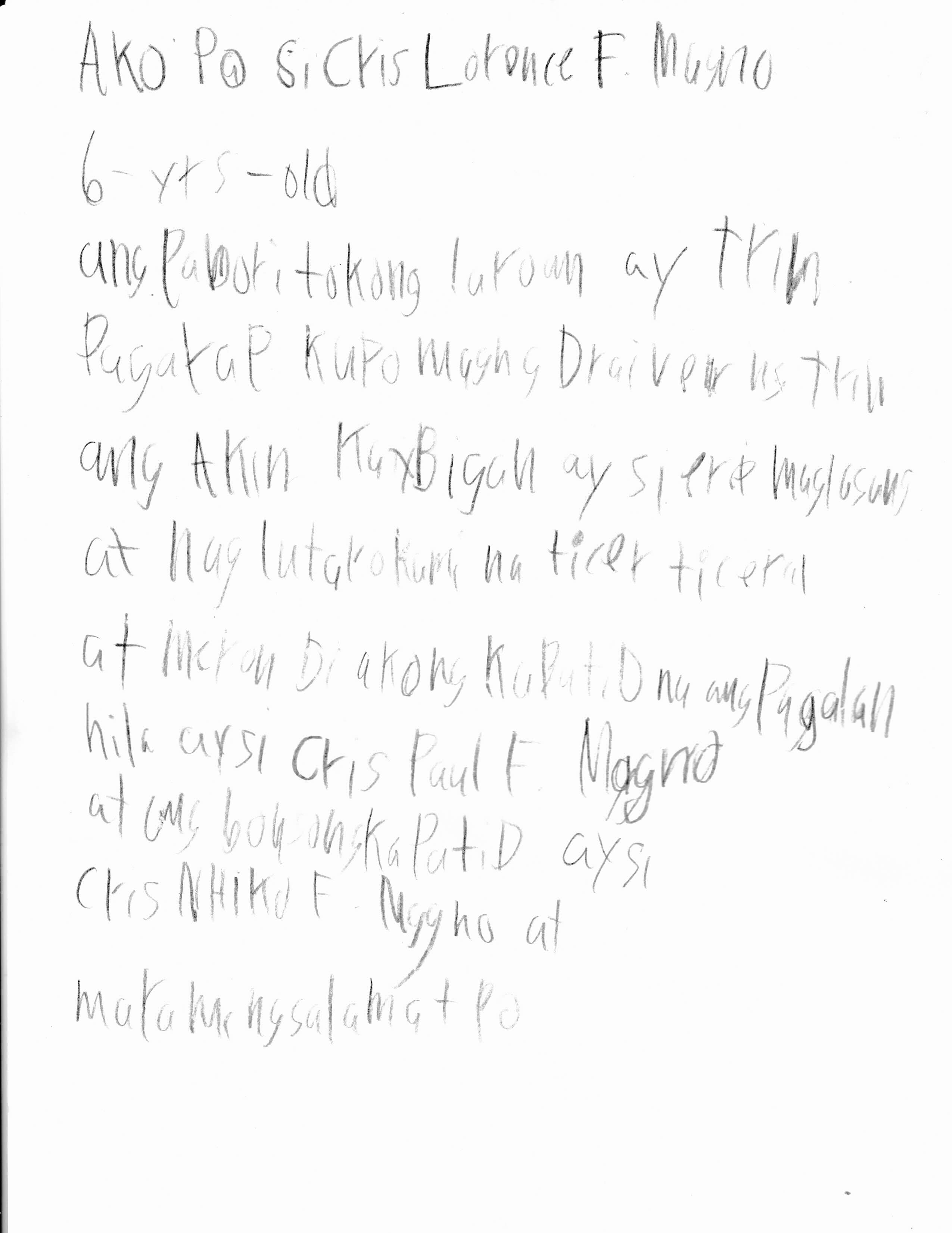 Cris Lorence ist 6 Jahre alt und er lebt mit seinen Eltern und Geschwistern zusammen. Sein Lieblingsfach ist Mathe, weil er sehr gerne mit Zahlen rechnet. Am liebsten isst er Äpfel, darüber freut sich seine Mutter sicherlich sehr.