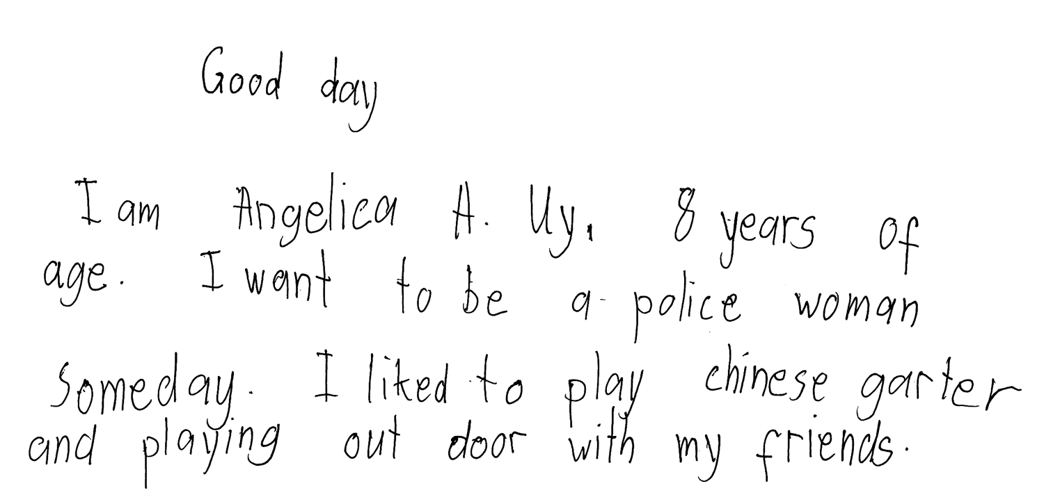 Angelica geht schon in die zweite Klasse. Ihr Vater verdient als Tricycle-Fahrer nur wenig Geld, ihre Mutter ist Hausfrau und kümmert sich um Angelica und ihre vier älteren Geschwister. Die finanzielle Situation der Familie ist so angespannt, dass Angelica stark vom Schulabbruch bedroht ist. Angelica hat viele Freunde, mit denen sie die freien Nachmittage verbringt und die auch ein wieder- kehrendes Motiv auf ihren Fotografien sind. Mit Knete und Barbiepuppen spielen gehört zu ihren liebsten Beschäftigungen. Außerdem liebt sie den Matheunterricht, weil sie schon richtig gut rechnen kann. Angelica möchte später auch als Polizistin arbeiten und so ihre Stadt sicherer machen.