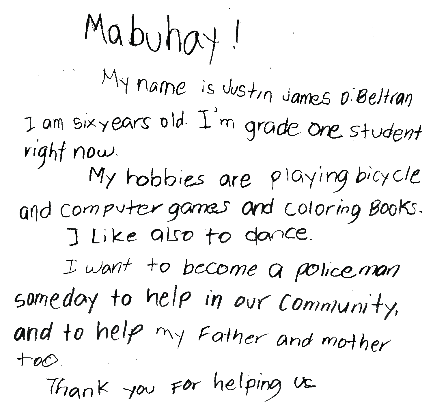 Justin ist sechs Jahre alt und hat fünf Geschwister. Seine Geschwister helfen seiner Familie oft im Haushalt. Sein bester Freund ist Grinmar, denn er unterstützt ihn beim Lernen. Am Liebsten mag Justin die Morgenstunden, dann darf er in die Schule gehen. Wenn er groß ist, möchte er Polizist werden, um anderen Menschen helfen zu können. Das Haus von Justins Familie steht kurz vor dem Einsturz. Der Boden ist gesäumt mit Löchern, so dass die Kindern beim Spielen aufpassen müssen, nicht in eines der Löcher zu stürzen. Justin ist ein fröhliches Kind und geht mit seiner Mutter und seinen Geschwistern sehr liebevoll um.