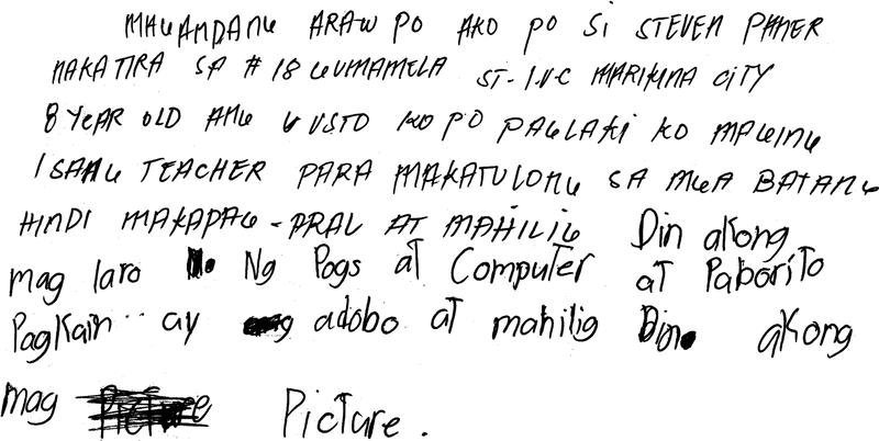 Steven besucht die zweite Klasse der Industrial Valley Elementary School. Sein Vater lebt nicht mehr und auch die Mutter hat die Familie verlassen. Steven hat acht Geschwister und lebt bei seiner Großmutter, die ihren Unterhalt als Haushaltshilfe bestreitet. Die Lage der Familie ist äußerst prekär, für die Ausbildung der Kinder fehlt das Geld. In seiner Freizeit spielt Steven am liebsten mit seinen Freunden das auf den Philippinen beliebte Kartenspiel “Pogs”. Später möchte er selbst einmal Lehrer werden. Sein Lieblingsfach ist Geschichte. Mit der Kamera ist er viel am Fluss unterwegs gewesen, auf der Straße und in Parks.
